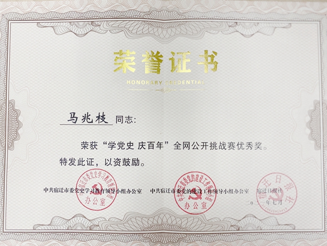 近日,宿遷市“學黨史、慶百年”全網公開挑戰(zhàn)賽落下帷幕,經過緊張激烈的角逐,我司馬兆枝同志榮獲優(yōu)秀獎。
