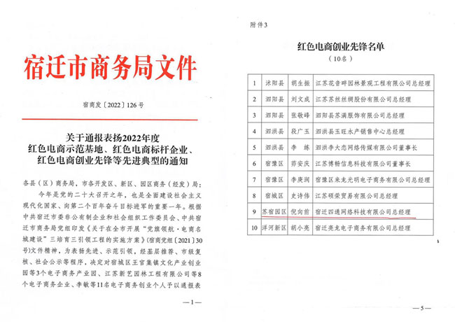 黨的二十大召開之年,市商務局為擦亮“電商名城”牌子,激發(fā)“電商名城”發(fā)展新動能,12月15日,組織紡織服裝產業(yè)鏈黨建工作暨“黨旗領航·電商名城建設”推進會。園區(qū)企業(yè)家四通科技董事長倪向前獲得“紅色電商創(chuàng)業(yè)先鋒”榮譽稱號。