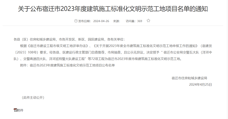 近日,宿遷市2023年度建筑施工標(biāo)準(zhǔn)化文明示范工地項(xiàng)目名單發(fā)布,蘇宿工業(yè)園區(qū)智慧信息產(chǎn)業(yè)園項(xiàng)目榮獲2023年度市級(jí)建筑施工標(biāo)準(zhǔn)化文明示范工地榮譽(yù)稱號(hào)。