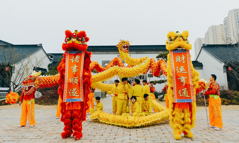 隨著激昂的鑼鼓聲響起,兩條金色巨龍和威風凜凜的醒獅閃亮登場。舞龍者們步伐矯健,巨龍在他們的舞動下時而盤旋,時而騰飛,身姿矯健,氣勢磅礴。醒獅更是靈動活潑,高高躍起,精準地叼取懸掛在空中寫有“財運亨通,諸事順遂”的對聯(lián),寓意著將財運和福氣傳遞給現(xiàn)場的每一個人,引得觀眾陣陣歡呼。